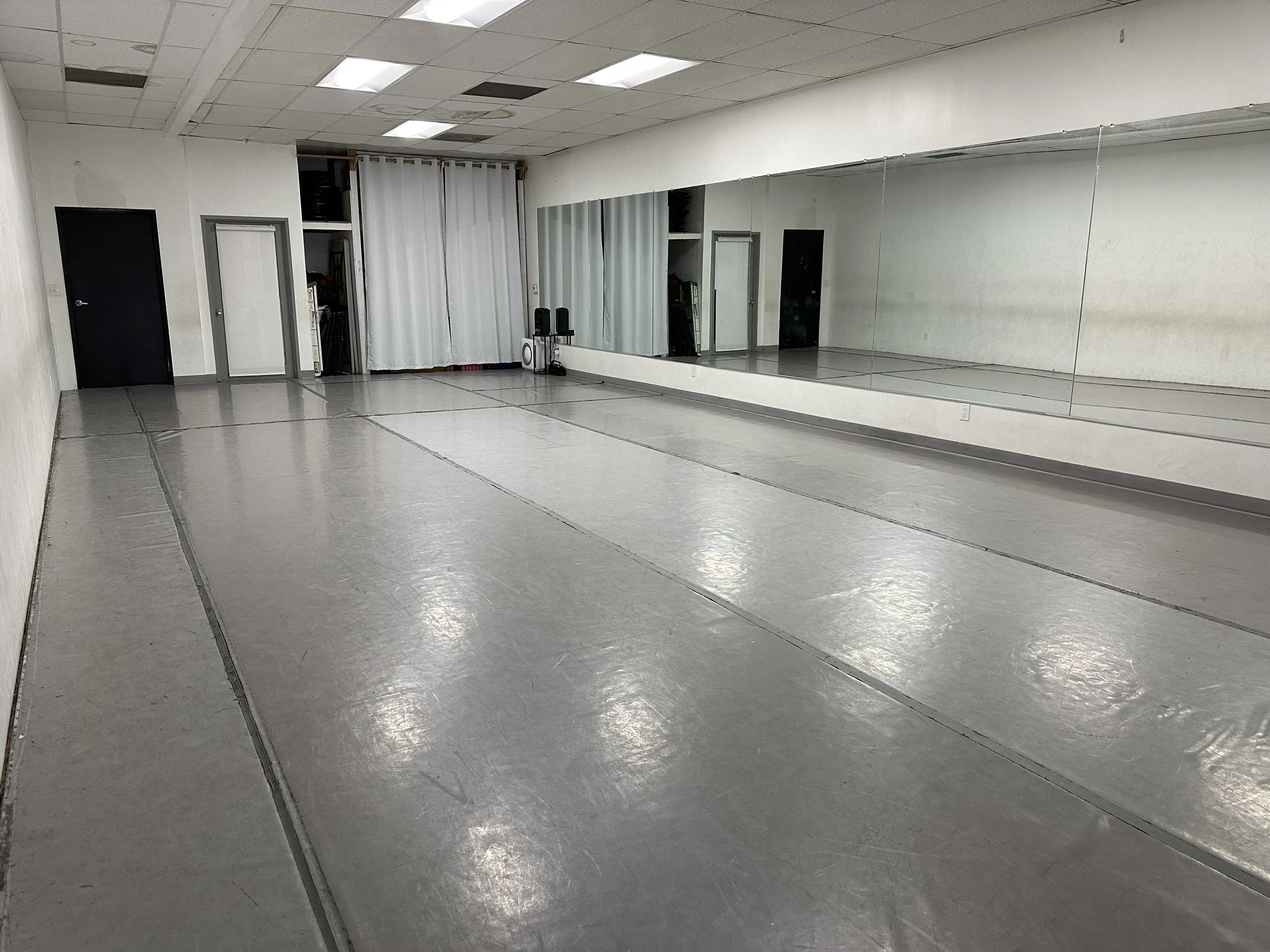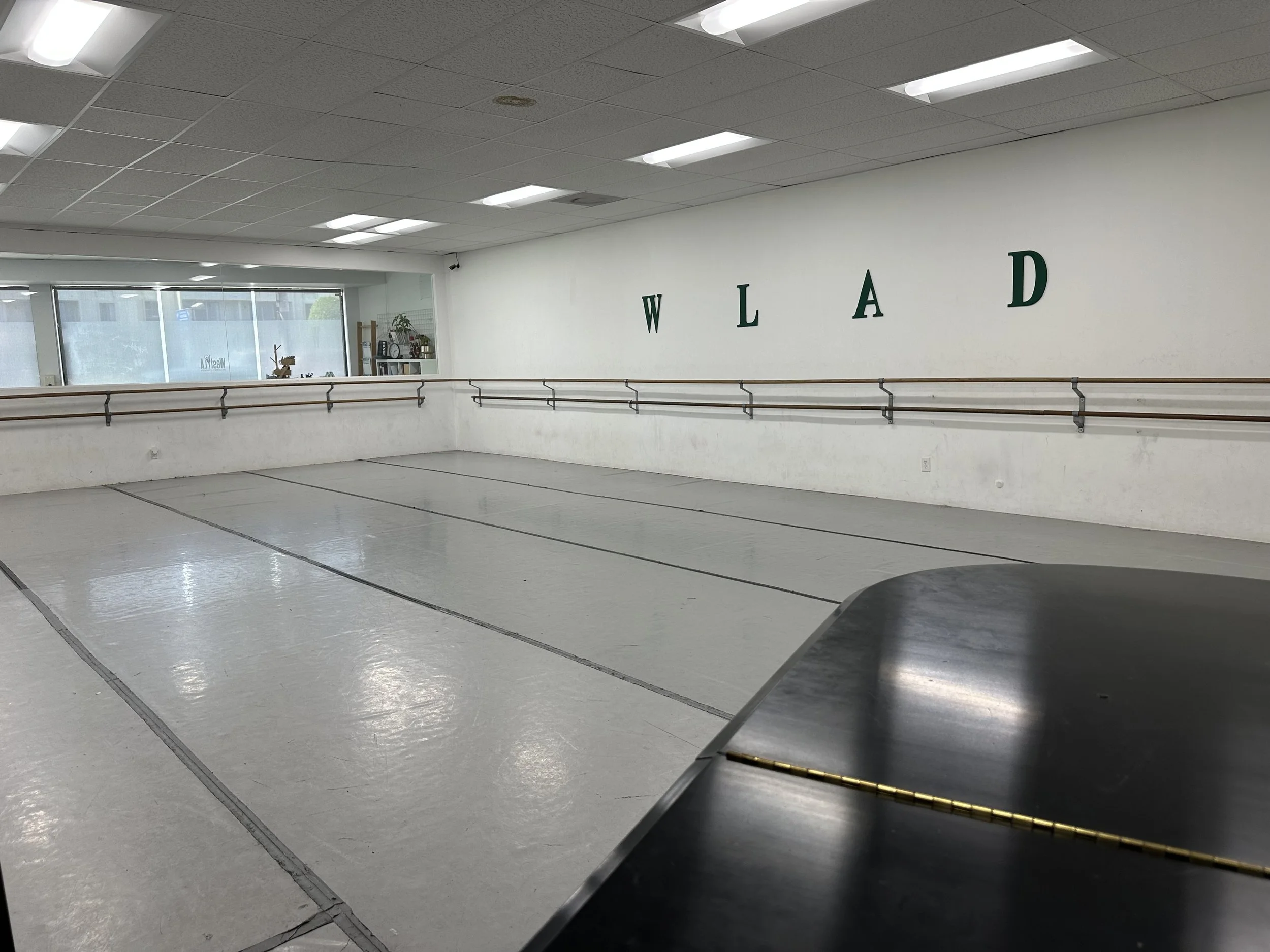 Studio 1 is a gorgeous studio equipped with barres along three walls, Sprung Marley floors, and a baby grand piano